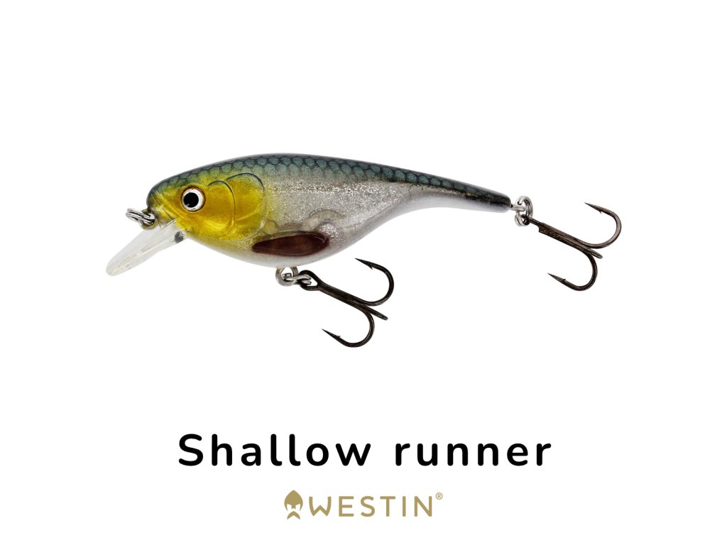 Plitvo delujoč Shallow Runner crankbait. Nevtralno uravnotežen (suspending) – ko prenehate z navijanjem, ne tone proti dnu in se ne dvigne proti gladini. Globina potopa: 1–2 m.