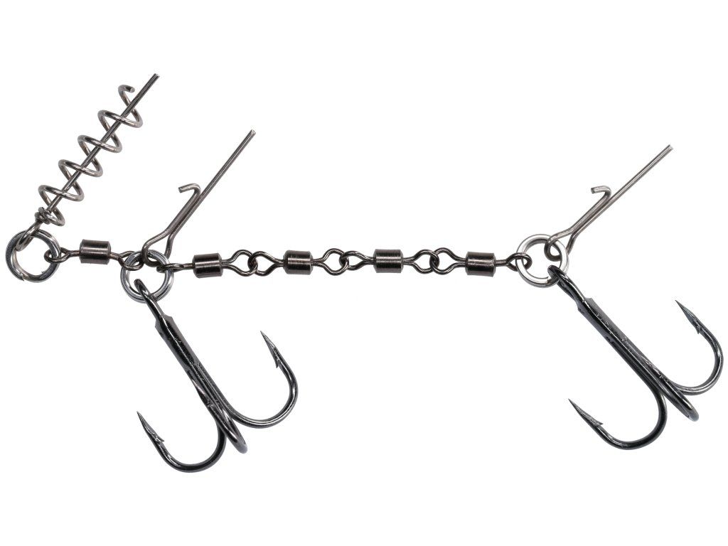 Stabilnost in gibanje: Sistem učinkovito stabilizira vabo, medtem ko vrtljivke omogočajo trojčkom prosto rotacijo, kar ribi preprečuje, da bi jih zlahka izpljunila ali snela.
